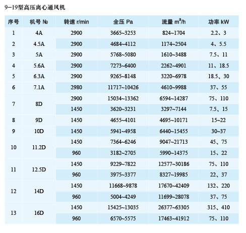 型式:本風(fēng)機為單吸入式,通常有№4、 4.5、5、5.6、 6.3、7.1、8、9、10、11.2、12.5、14、16共13個機號。